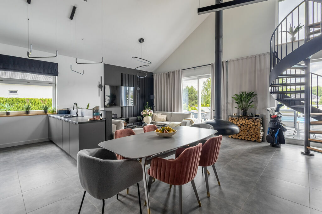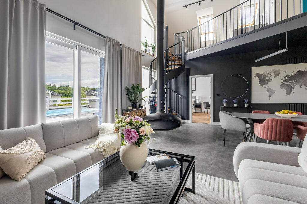funkcjonalny układ – 4 sypialnie (dla 8 osób), sauna, pokój z jacuzzi, przestronny salon z otwartą kuchnią i dużym kominkiem,